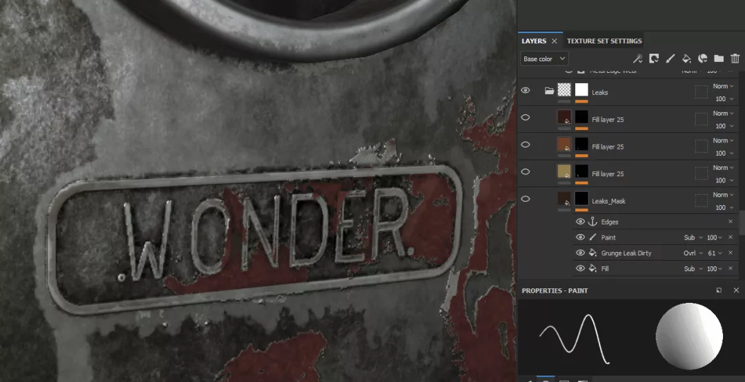 例如,由于漏油的材质,我在油漆层上设置了一个锚点并从中建立了较暗的边缘蒙版,以便我可以自由地绘制较暗的边缘时自动调整到它。
