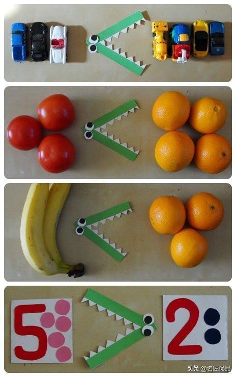 3辆车比4辆车少,3比4要小;2根香蕉比3个橙子少,2比3要小……一开始使用同类的物品,比如都是玩具小车、都是橙子。再慢慢扩展到不同的物品,比如橙子堆和西红柿堆的比较。最后变成一堆里面有橙子、橘子、西红柿等的比较。