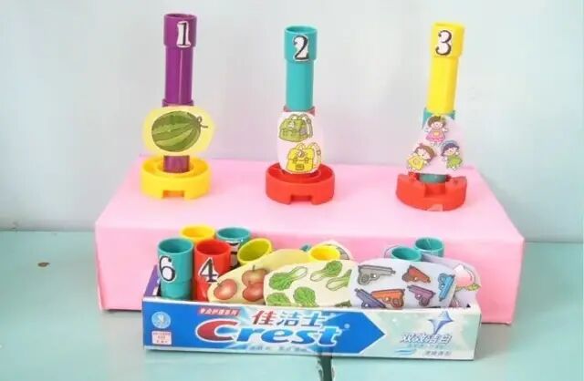 方法:将酸奶盒和牙膏盒装饰上漂亮的颜色,将圆形玩具贴在盒上作为底托,在管型玩具上分别贴上不同数量的实物卡片和数字卡片。