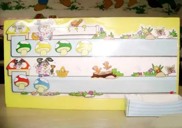 将图片剪好,压模,贴到板子上,再用透明硬模放到让幼儿操作插蘑菇的地方,然后将蘑菇若干压模,投放到小盒子里,使幼儿可以将蘑菇按颜色规律排序。