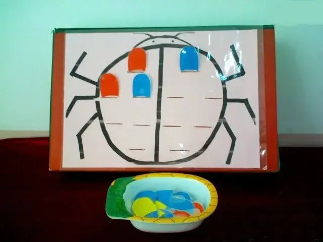 1、主体盒:用油性彩笔绘画出瓢虫形状,用壁纸刀刻画出可支持幼儿一维排序的豁口,最终将制作完的彩纸用双面胶粘到纸盒上。
