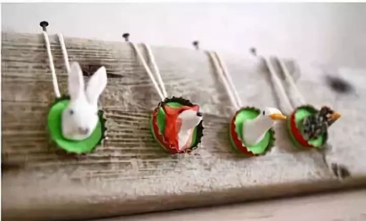 制作这款装饰小挂件,除了瓶口还需要准备毛毡布、陶土/粘土、细绳。首先用陶土或粘土制作出可爱的小动物玩偶;然后将毛毡布剪裁成跟啤酒瓶口完全相同大小的圆片;最后根据下面的图解将它们黏贴起来即可。将这些纯手工制作的小玩意悬挂在充满岁月痕迹的木条上,简简单单,却别有一番风味!喜欢就一起来DIY试试吧,给自己的家居增添独一无二的小装饰~~