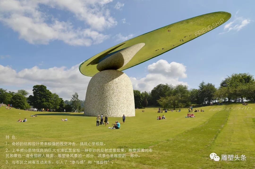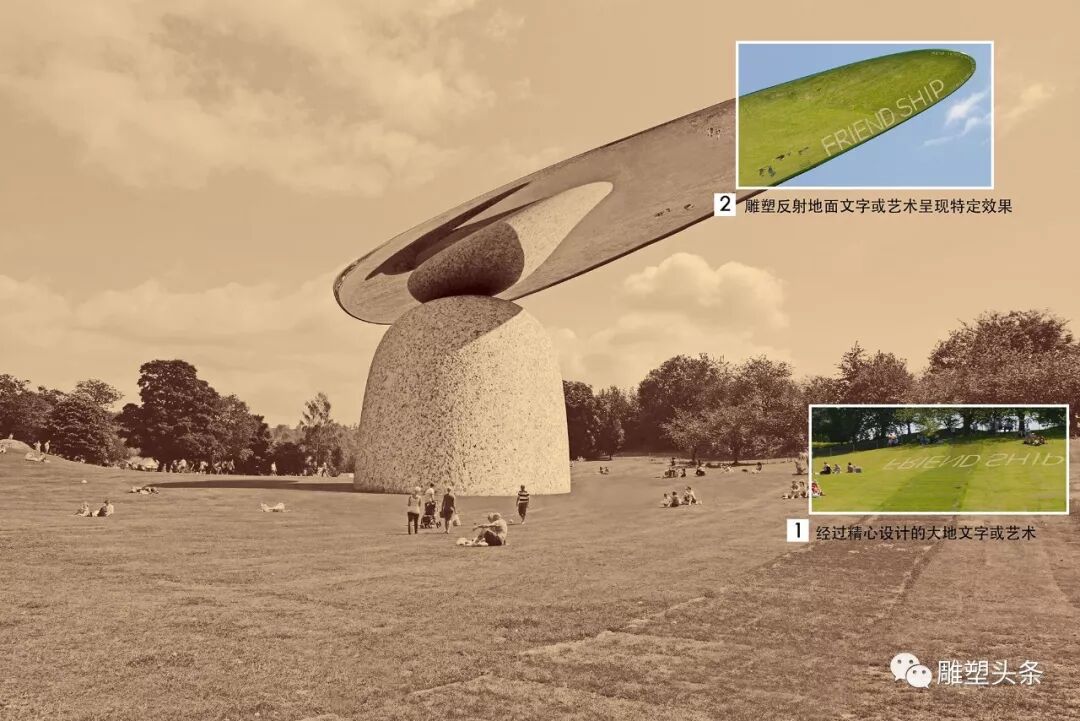 引入大地艺术,使位于地表的艺术图形或文字景观,在雕塑弧面的反射下形成视觉亮点。建议将国际友好的slogan,如FRENDSHIP用石块在经过精心计算设计的位置堆积拼嵌于地面,游人在特定位置透过雕塑反射有惊奇的发现!这个特定位置将成为游客最为喜爱的拍照点。