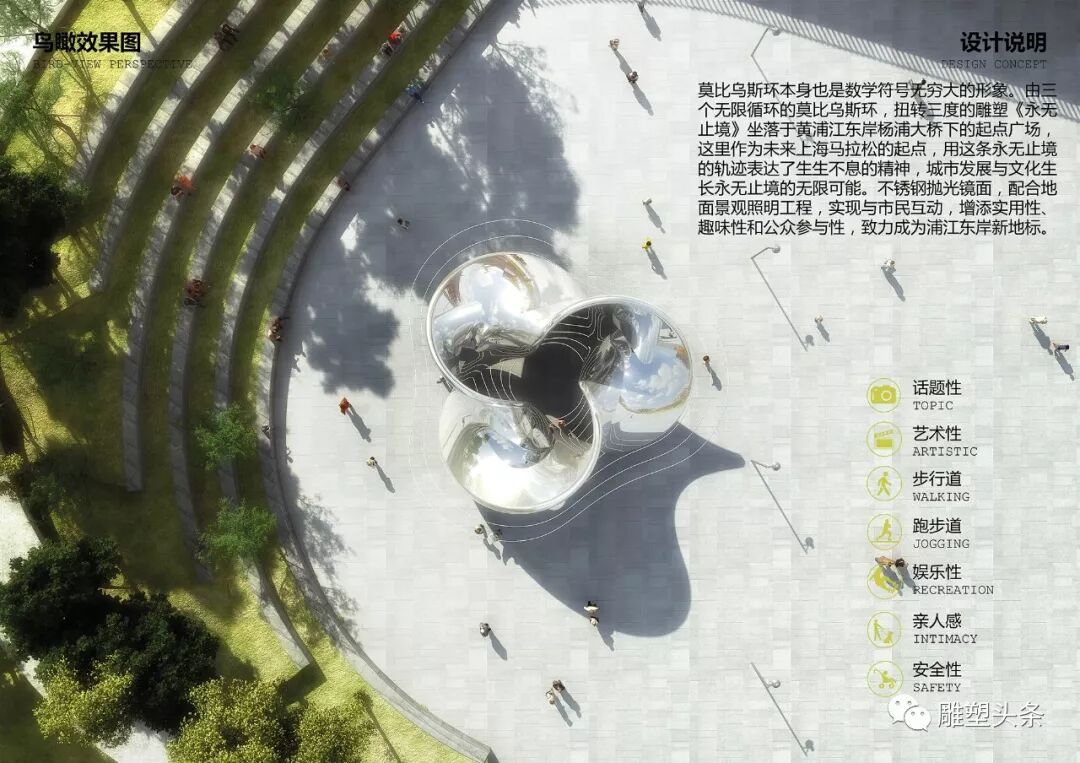 莫比乌斯环本身也是数学符号无穷大的形象。由三个无限循环的莫比乌斯环,扭转三度的雕塑《永无止境》坐落于黄浦江东岸杨浦大桥下的起点广场,这里作为未来上海马拉松的起点,用这条永无止境的轨迹表达了生生不息的精神,城市发展与文化生长永无止境的无限可能。