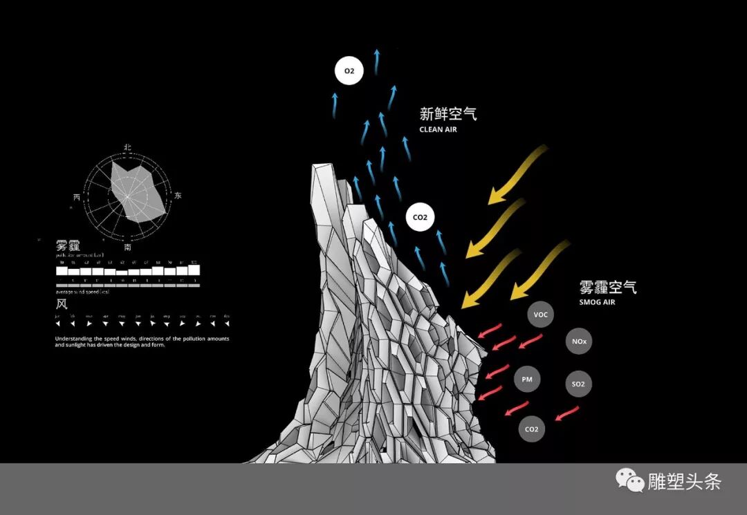 这是一个会动的雕塑。其形态抽象,含义深刻。利用高科技空气动力学原理,将其雾霾吸收,释放新鲜空气。同时通过光源,风源,夏天喷凉雾,冬天吹暖气, 自身循环具有生命力。這也正好象征着上海是座科技创新,包容开放,活力四射的世界大都市。