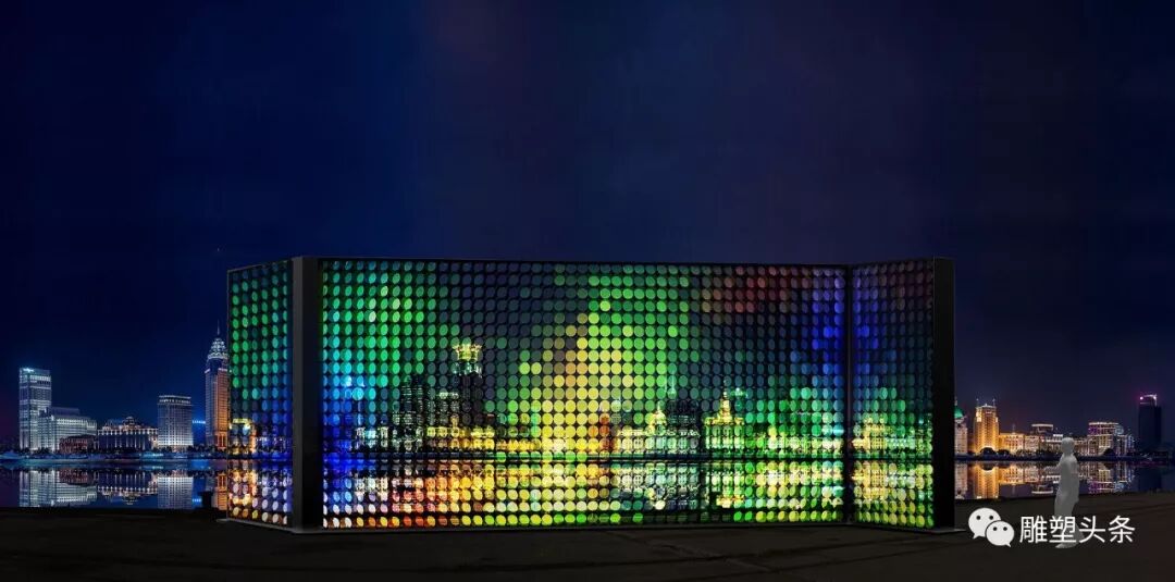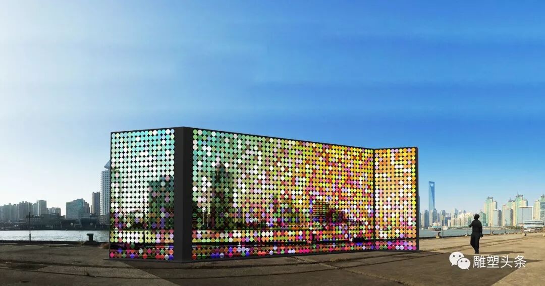 我们一直在问艺术和社会的关系,艺术和城市的关系,公共艺术在城市中的意义,以及好的公共艺术的核心标准是什么,答案可能有很多......... 但我想用几个关键词语来表达我的理解。优秀感,解放感,苏醒感,和安抚感,在浦江两岸这样的弄潮位置,举世瞩目,作品本身的关于外形的本体语言几乎会弱化于整个场景空间里,于是突发奇想,借势现景,作品用取景框方式,点彩印象派画风,用彩色玻璃圆棒排列而成,透出西岸的景象,虽来源于真实。但经过此作品的过滤,光的折射,幻象重生,这时观众所关注的已不是真实的风景,而是此画面的景象,达到了移目换景的目的。这可能也恰恰符合了我对城市艺术的理解和表达。
