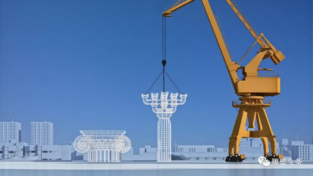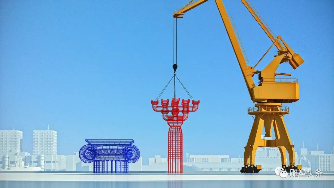 中式斗拱和西式罗马柱头均以不锈钢管焊接成型,以减轻重量和风阻,同时也便于施工和安装。塔吊整体色彩保持原状,中式斗拱和西式罗马柱头分别施以红色与蓝色,或全为白色。
