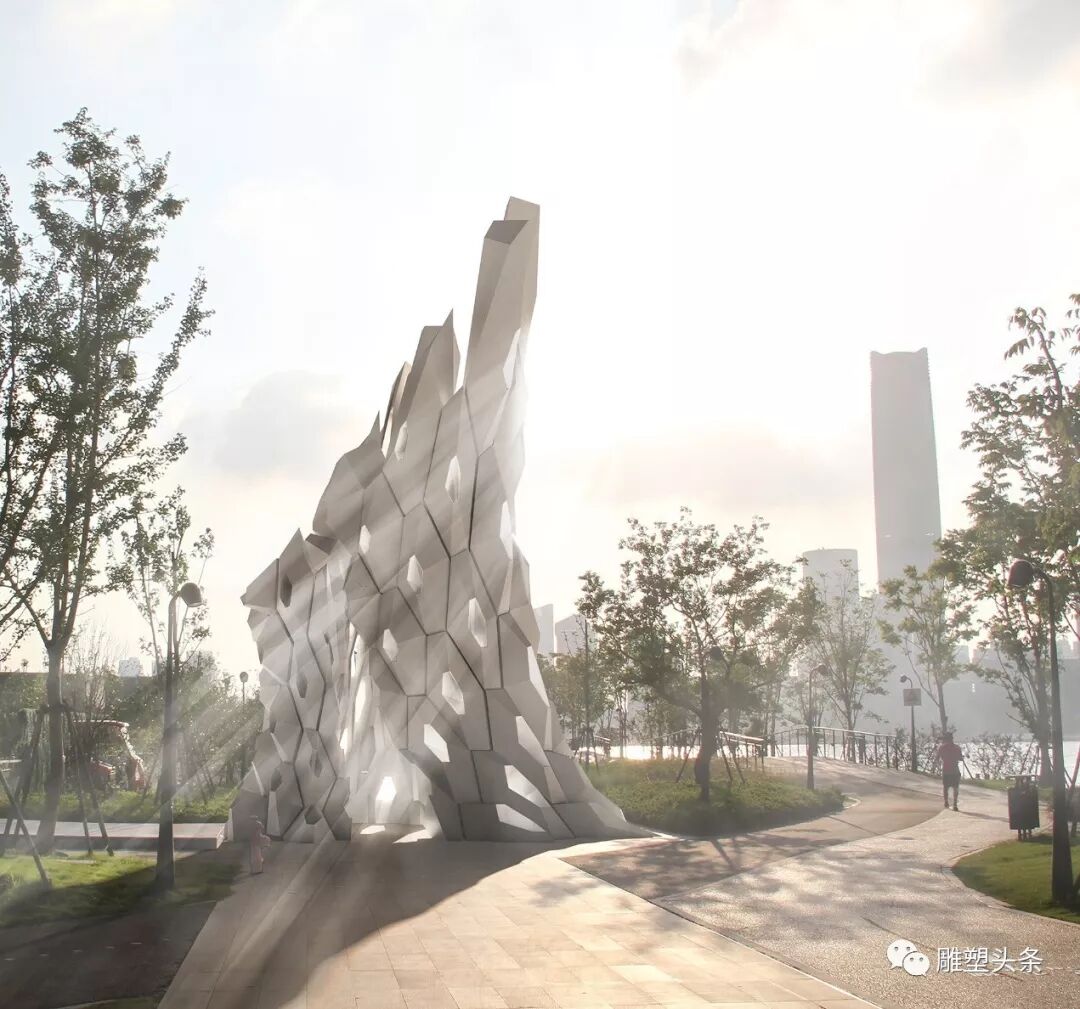 原为造船厂的中栈绿地,是近现代重要的工业区,历史悠久且具有阳刚之气。码头的厚重与刚性是这件作品所要体现的。一个像建筑物一样的抽象形体树立在码头,抽象的形块像是经过数学公式计算后的严密分割与组合,疏密有致。阳光洒在雕塑上,阴与阳的比例暗示地貌与历史的厚重,将工业与码头的气质驻留在雕塑的形态中。