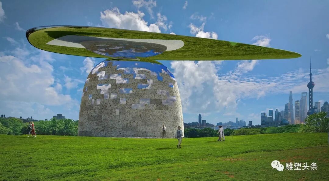 在雕塑下部分(石质结构部分)大轮廓不变的前提下,部分嵌入与上部肌理一致的镜面不锈钢材质,由此将天空映入雕塑,并形成上下两部分互为反射,最终呈现悬浮视感的特殊景观,视觉更丰富,更具有神秘色彩。但制作难度增加不少,造价和后期维护成本增加明显。