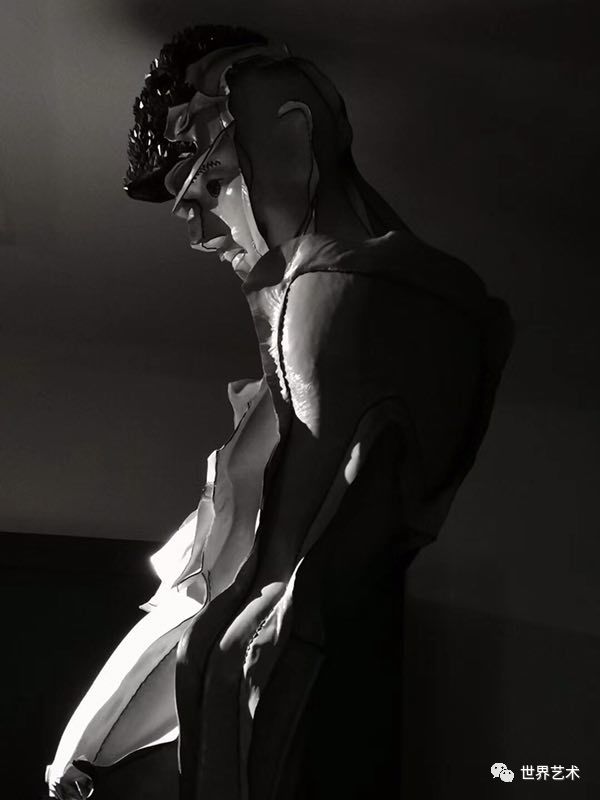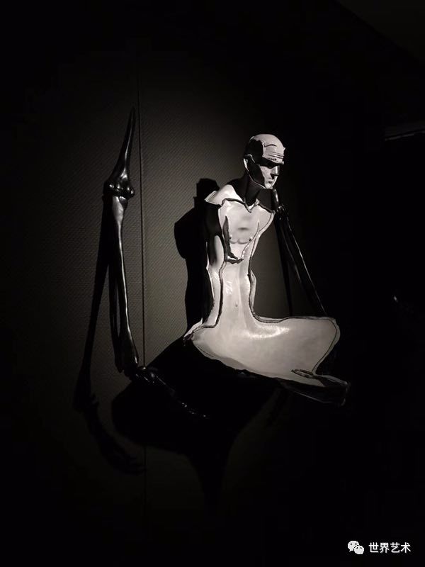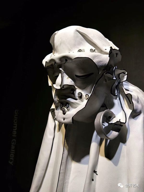 他的作品一反前人泥和木、铁等常用的织物,采用皮革而此软性柔润的材料,注重线条走势。极其简练地描画出诸种人物的神态意象,其独有的观念和力量源泉来自他所使用的方法,即排除把线缝在里面的缝纫惯例,而将皮革的连接线鲜明地间离般陌生地保留在作品外面。这种另类的类似西服外套和衣裙上的荷叶边区域化的表面处理使他的作品具有怪异的凹陷感和莫名的精神内涵,内在的虚无感和空洞的装饰性趣味透露出荒诞离奇的喜剧效果,在其外表荒谬的嬉笑中勾划出他们一代人对社会和人情世故的视角。这种感觉是80后年青人的年龄和精神特征使然,由此,他的音乐创作被带到了当代表演艺术的精神语境之中遨游,他由此亦乐此不疲。