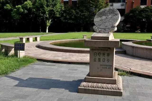 根据晷放置地点的纬度不同,晷面与地平面之间的夹角(图中蓝色的角)也不同,纬度越高,晷面与地平面之间的夹角越小。比如故宫里的晷与北京某著名大学校园里的晷: